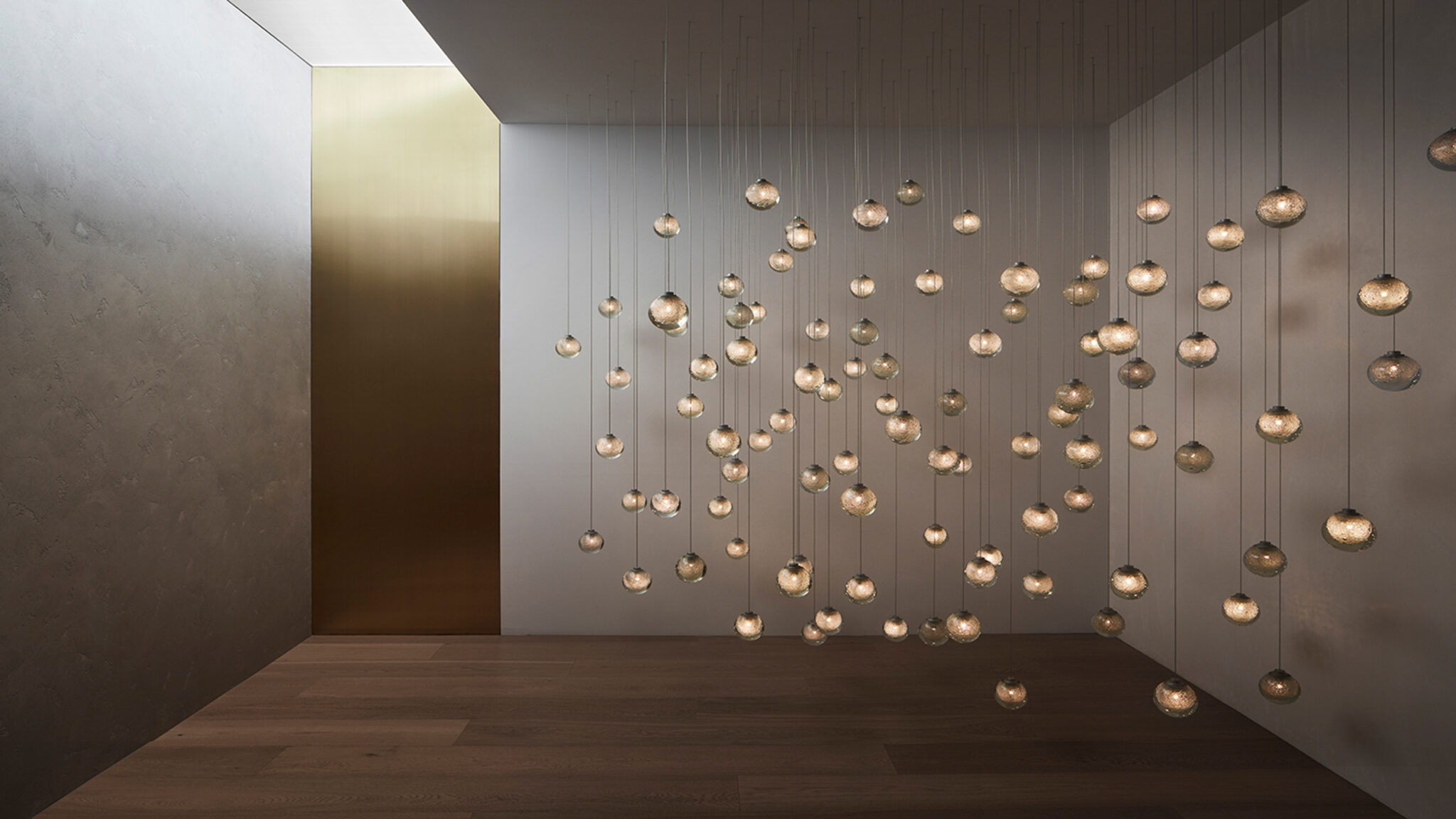 Stepping through a discreet recessed doorway cut into the dark, ivy-covered facade, visitors are met with a vast double-height space, more akin to an art gallery. Custom terrazzo floors and a palette of natural oak and textured plaster finishes act as a backdrop to a range of mouth-blown glass and hand-crafted light fixtures. Brass wall panels are set into the walls below a series of skylights to transform the effect of daylight, introducing a sense of drama and movement to a deliberately minimalist, pared back series of spaces.