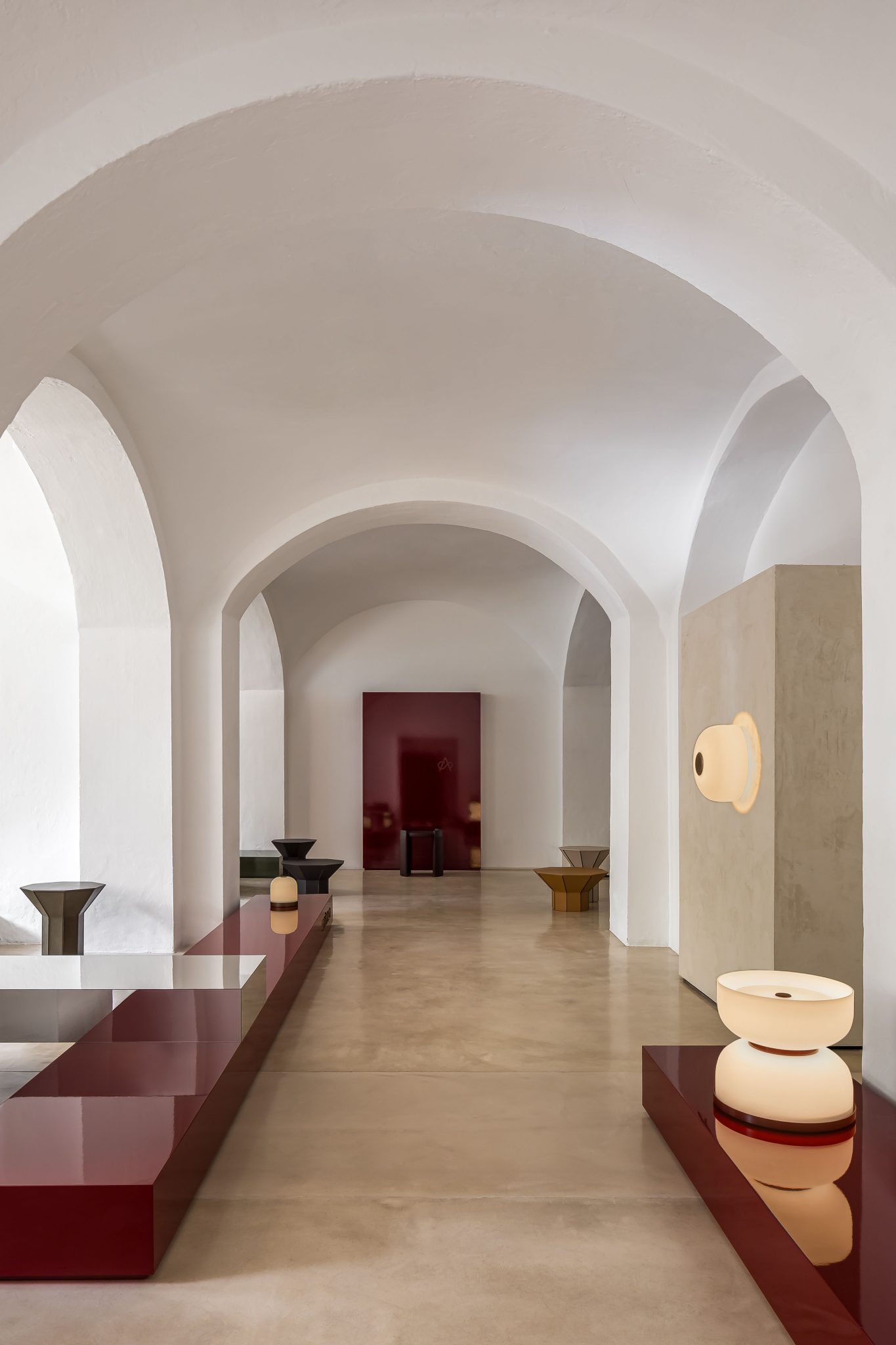 Situated in a basement in the Brera design district, rich blocks of colour and a combination of high gloss and textured surfaces create a bold backdrop for the new products and guide visitors through the space. Integrated up-lighting within the taller blocks creates an an ethereal, uplifting wash of light across the dramatic barrel vaulted ceiling