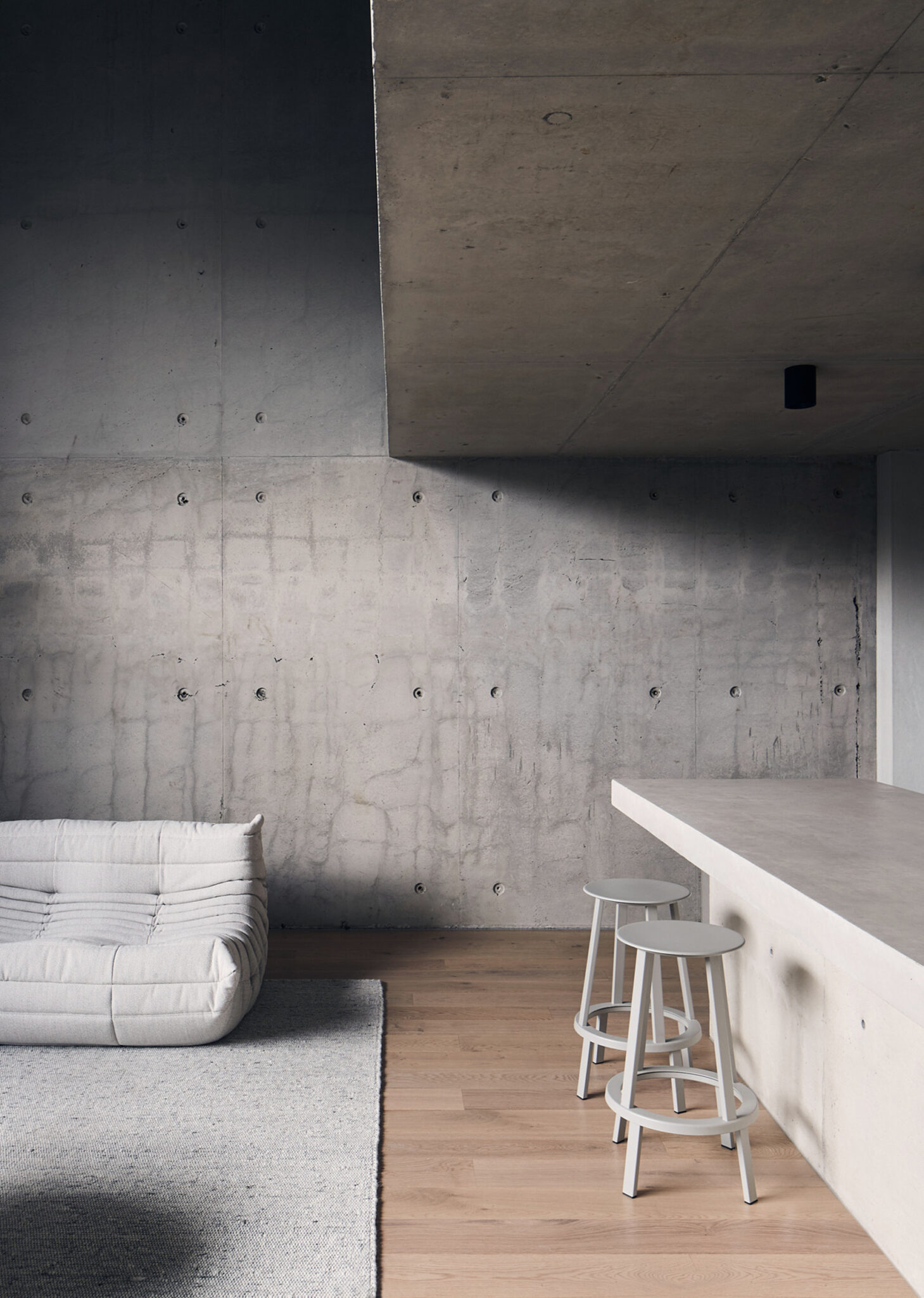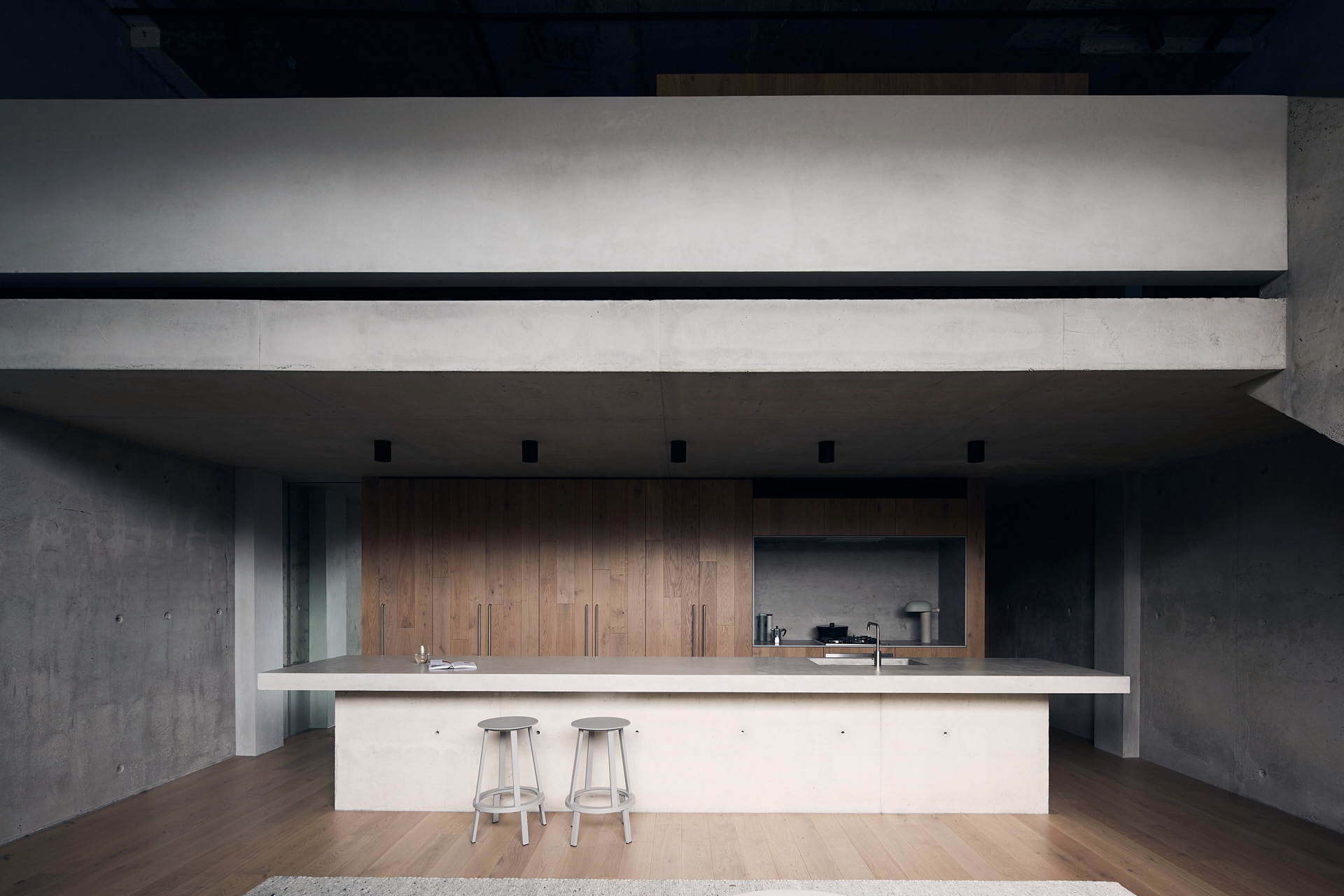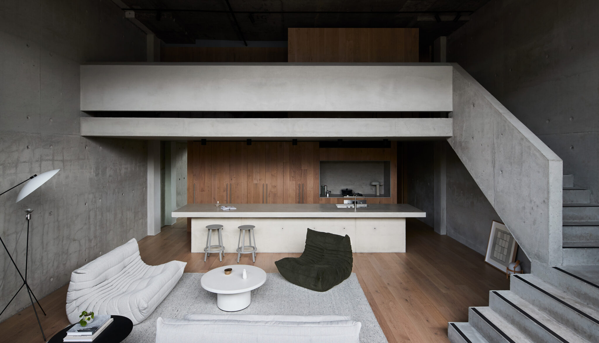 This split level apartment sits within the remnants of a 1970’s Brutalist commercial building recently redeveloped into a series of apartments & townhouses. The ground floor was excavated 1.5 mts below street level creating space for a mezzanine bedroom, walk-in robe & ensuite, with kitchen, laundry & powder room sunk below ground. The living area is defined by a dramatic double height space. The design of the apartment parallels the Brutalist aesthetic of the existing building,accentuating textures with poured in-situ concrete stairs and off-form concrete walls. The material palette is robust yet simple with flooring and joinery in textured white oak.