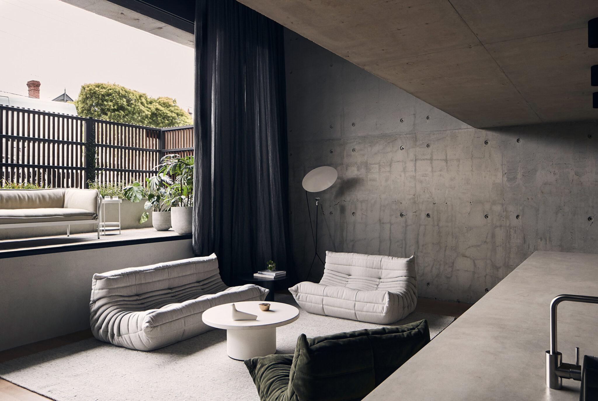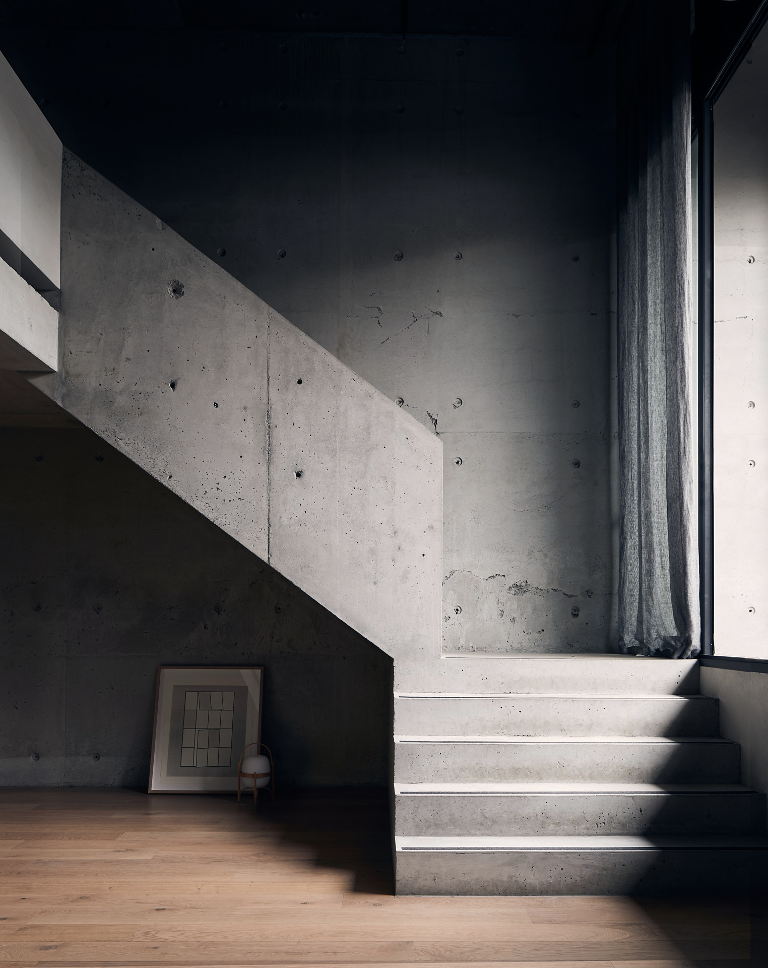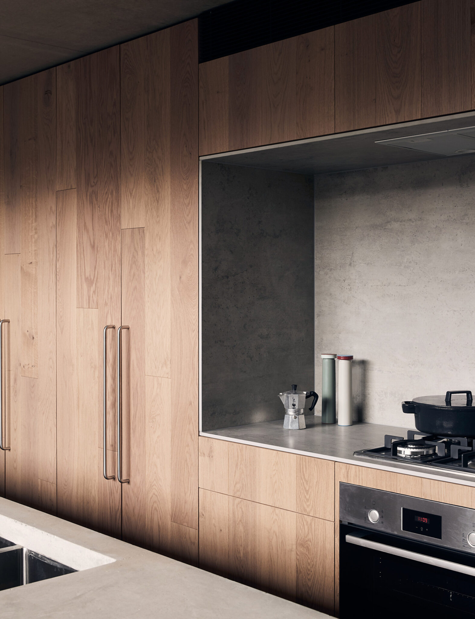 This split level apartment sits within the remnants of a 1970’s Brutalist commercial building recently redeveloped into a series of apartments & townhouses. The ground floor was excavated 1.5 mts below street level creating space for a mezzanine bedroom, walk-in robe & ensuite, with kitchen, laundry & powder room sunk below ground. The living area is defined by a dramatic double height space. The design of the apartment parallels the Brutalist aesthetic of the existing building,accentuating textures with poured in-situ concrete stairs and off-form concrete walls. The material palette is robust yet simple with flooring and joinery in textured white oak.
